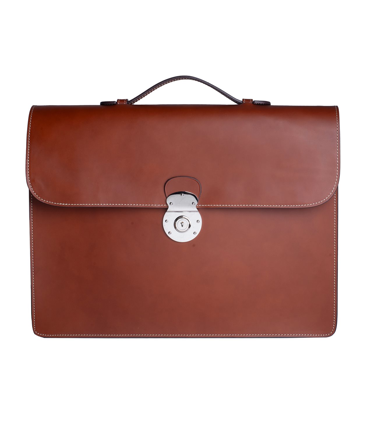 Our classic briefcase in a rich cognac shade, sewn in vegetabe tanned calf leather and finished with an off-white contrasting seam.