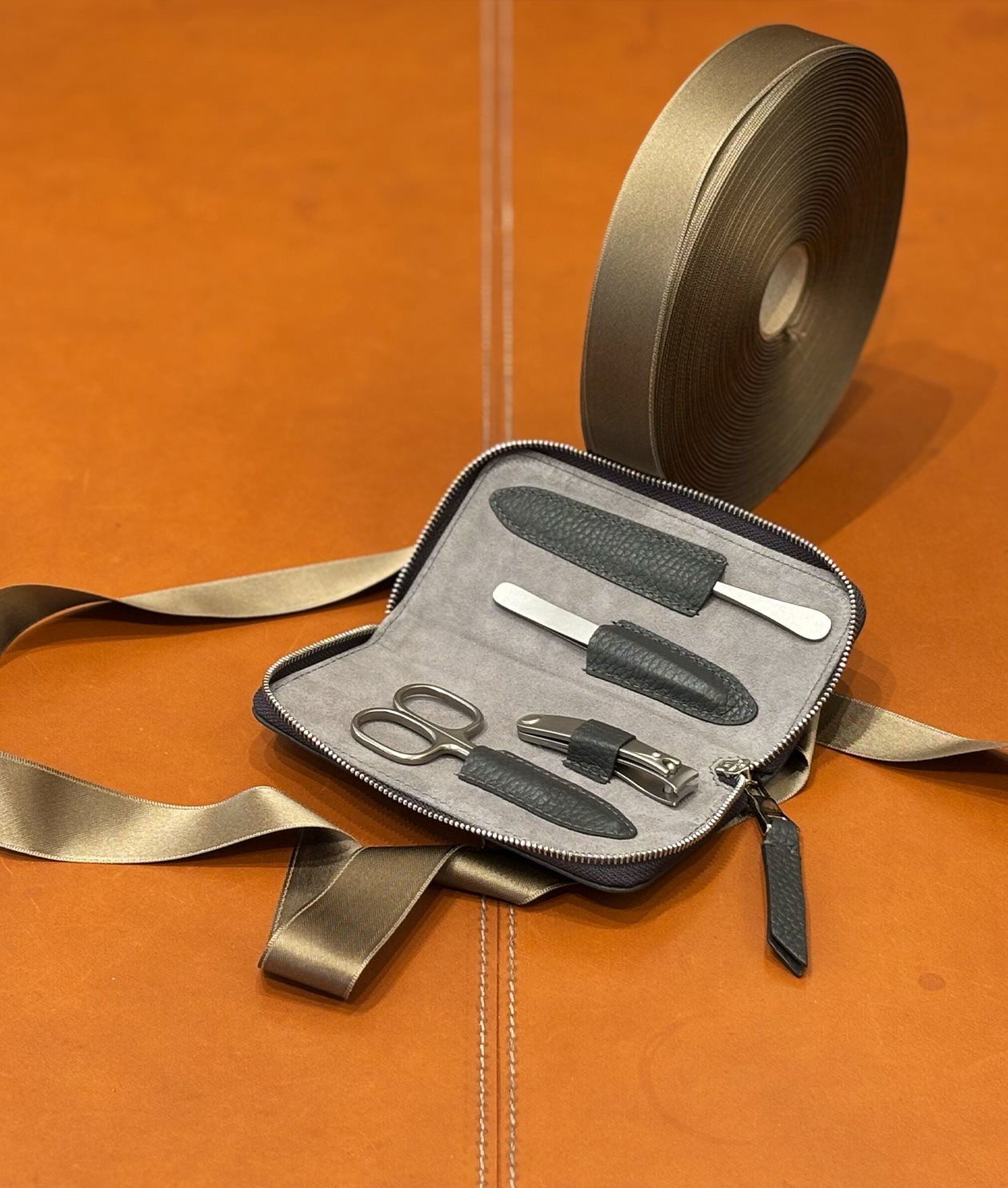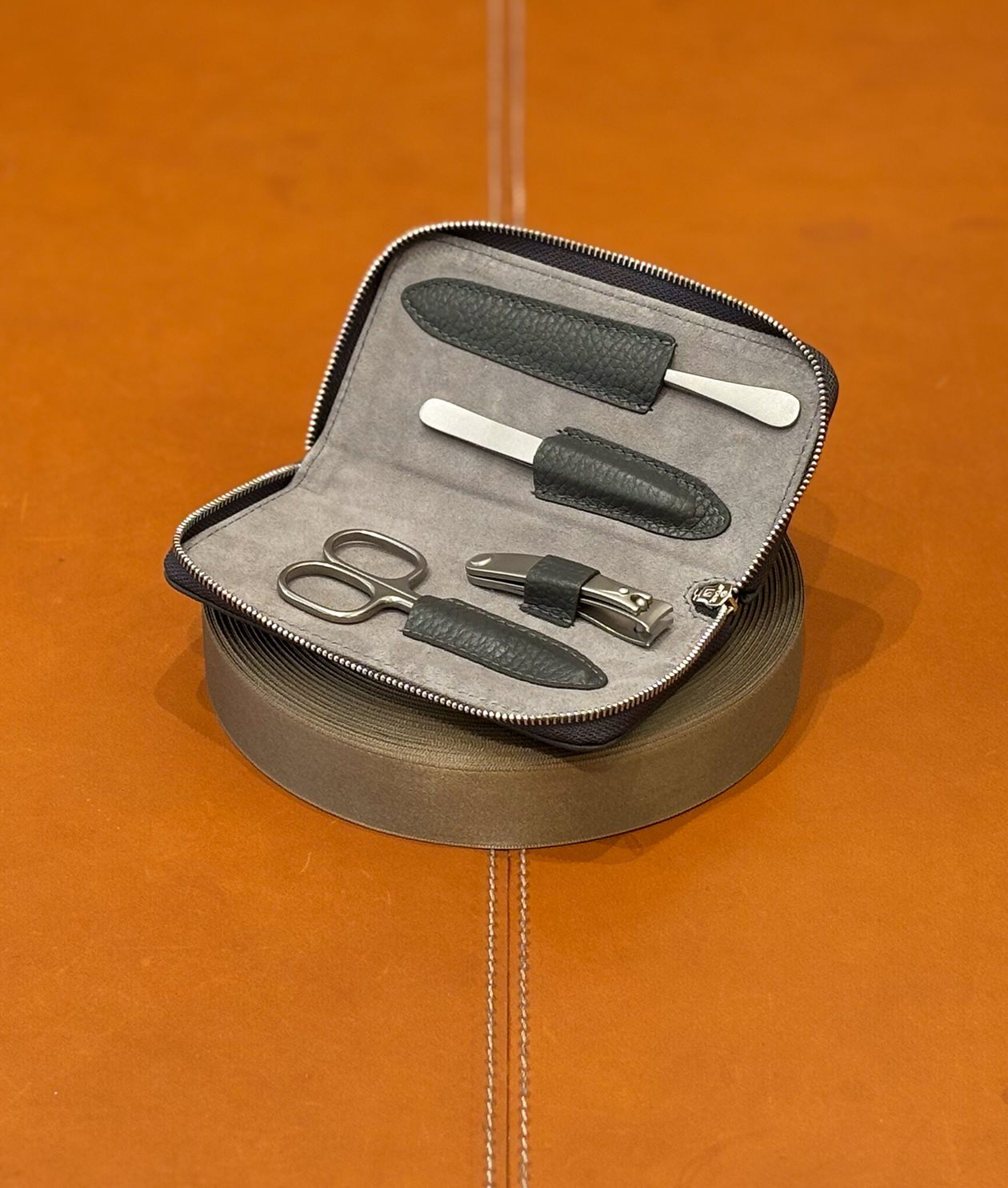 Our manicure set with four tools, sewn in a grained calf leather.