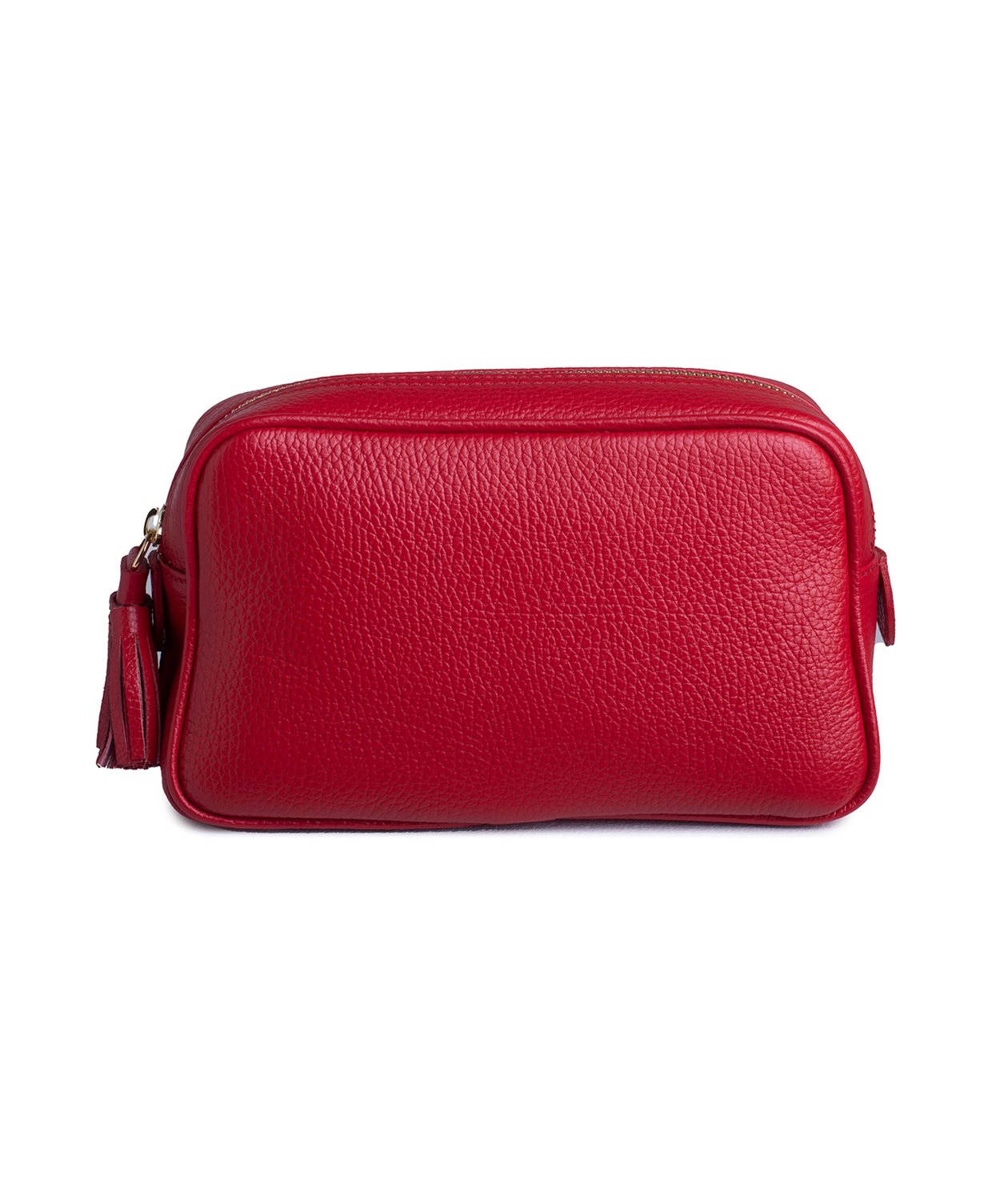 A neat toiletry bag, sewn in a red, grained calf leather with a rounded rectangular shape and leather piping.
