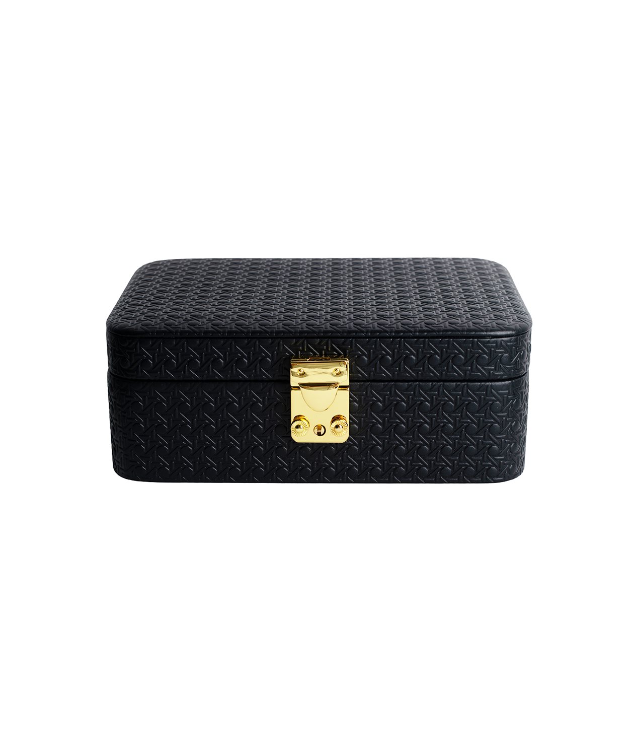 Our jewellery box with rounded corners, dressed in an embossed calf leather featuring our signature six-way weave.