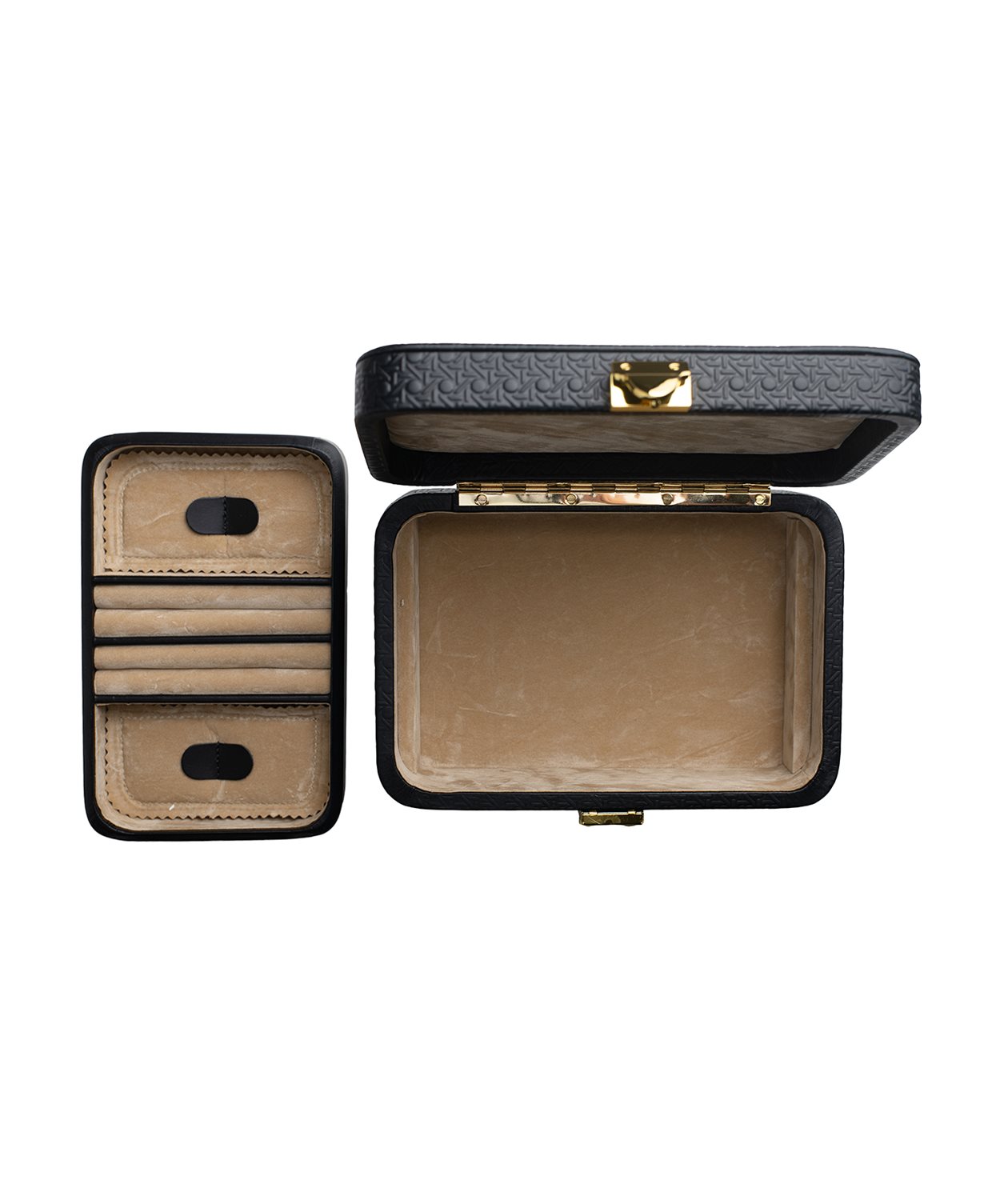 The box is lined with a beige fabric and offers one tray with rows for rings, cufflinks and earings as well as two open compartments for jewellery and accessories.