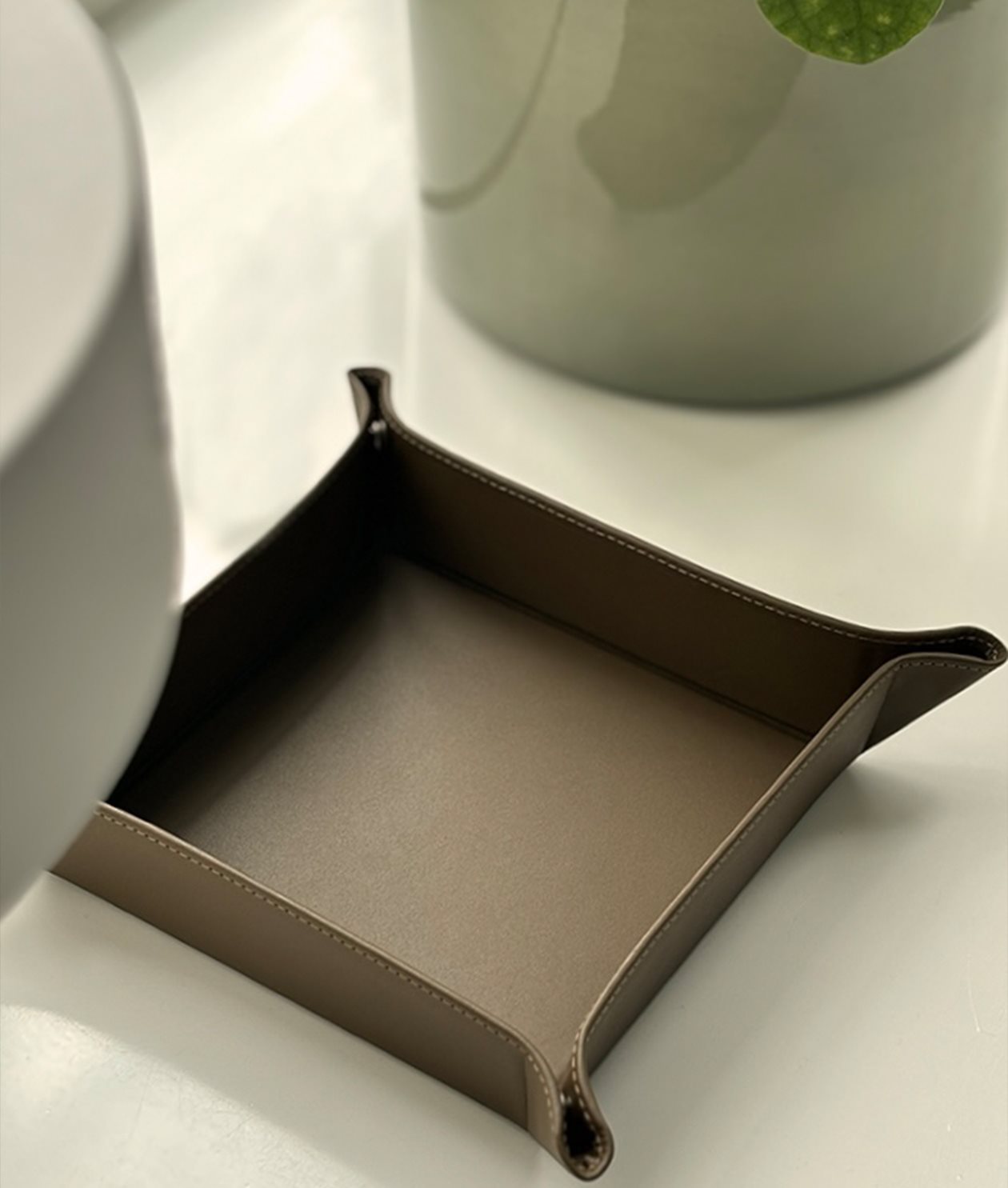 Our large tray, crafted from supple calf leather, keeps your essentials organized. This versatile tray is designed to hold jewellery, watches, keys, and other valuables accessible and safe. It makes for a perfect valet in the hallway, keeping the family’s keys and everyday essentials in one place.