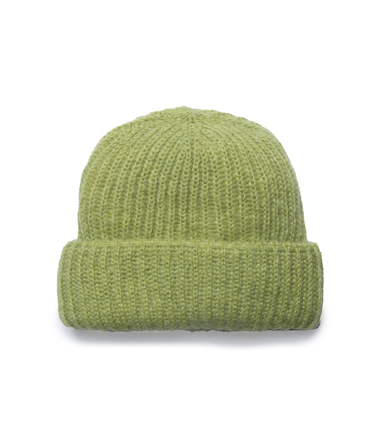 Vår beanie i en mohair mix med brett uppvik, i en mjuk pistagefärg.