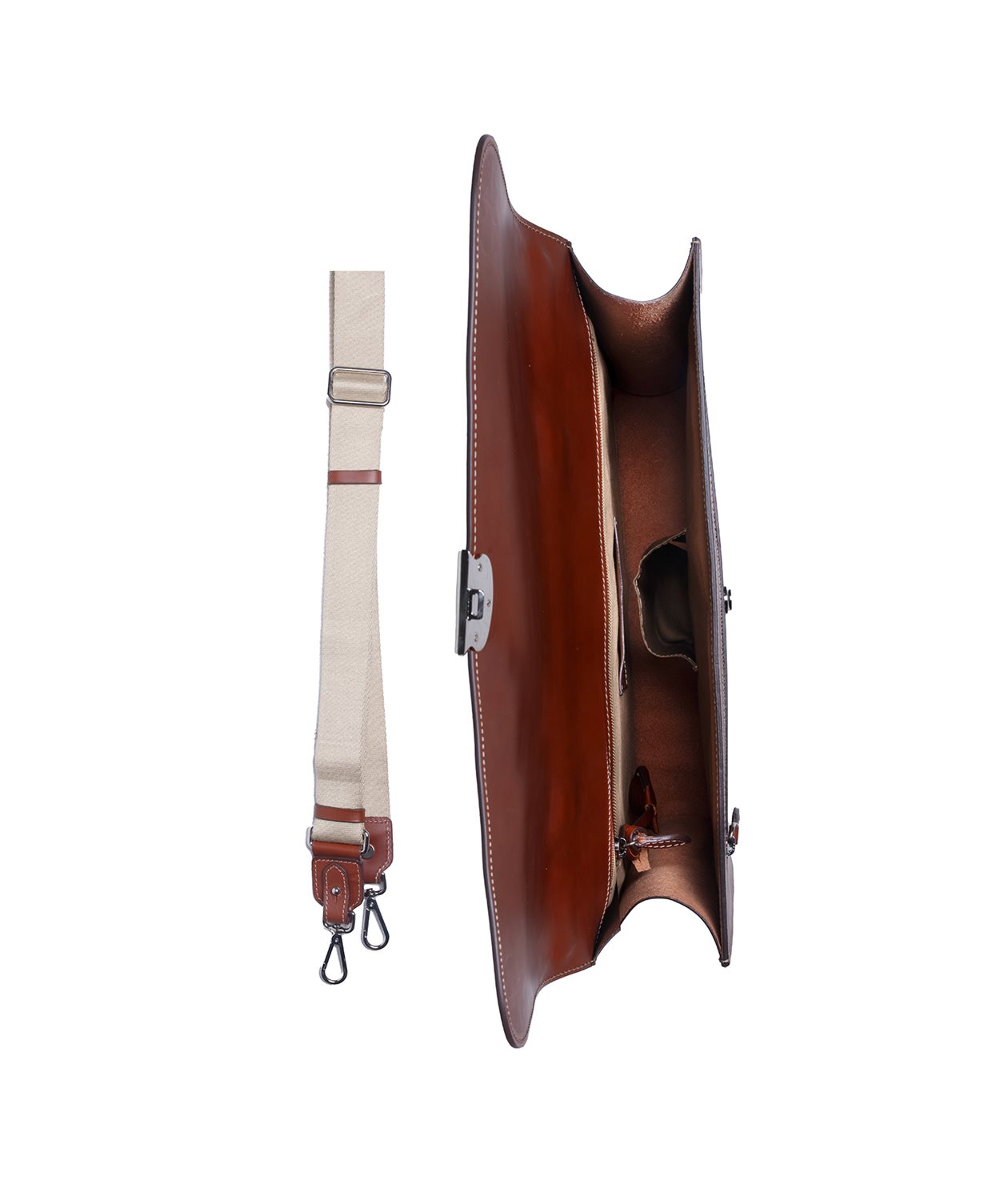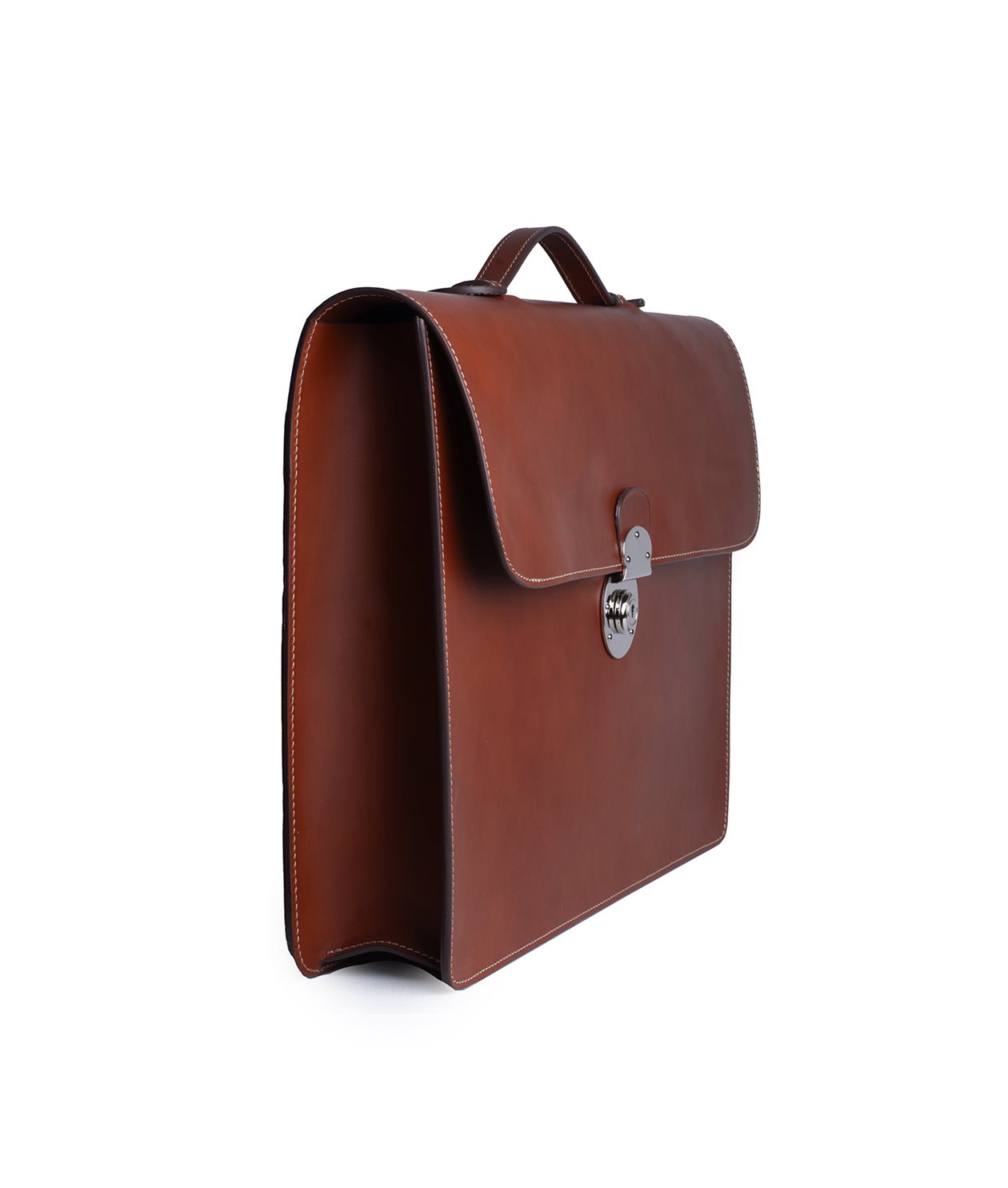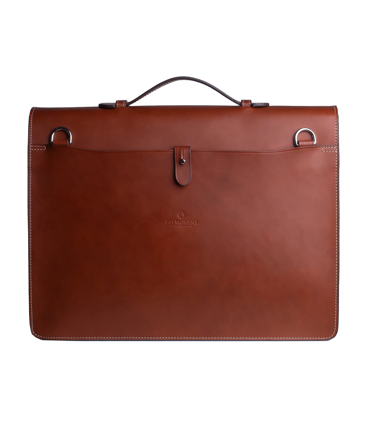 Vår portfölj i vegetabiliskt garvat kalvläder är utrustad med en extern fullbreddsficka och ett fack med ett fack med dragkedja, samt en öppen ficka för telefon och en kortficka. Portföljen är sydd med en kontrasterande söm som ramar in och framhäver portföljens former.