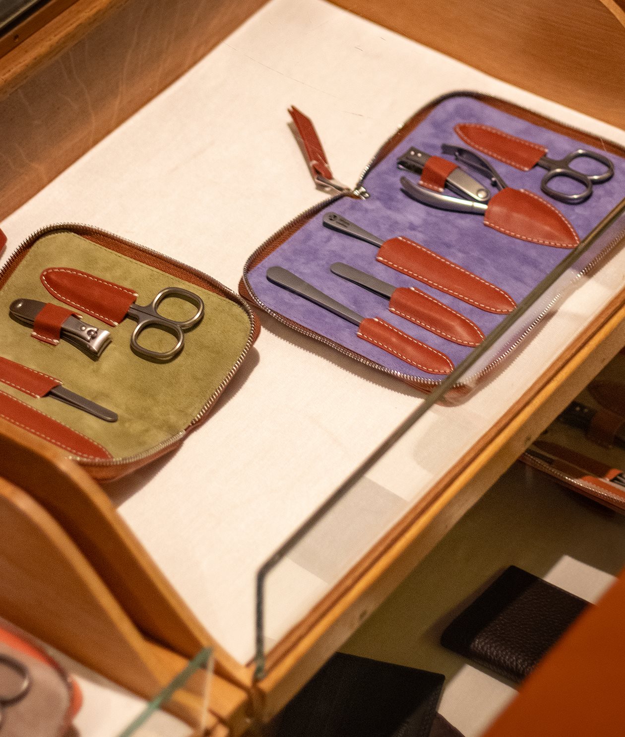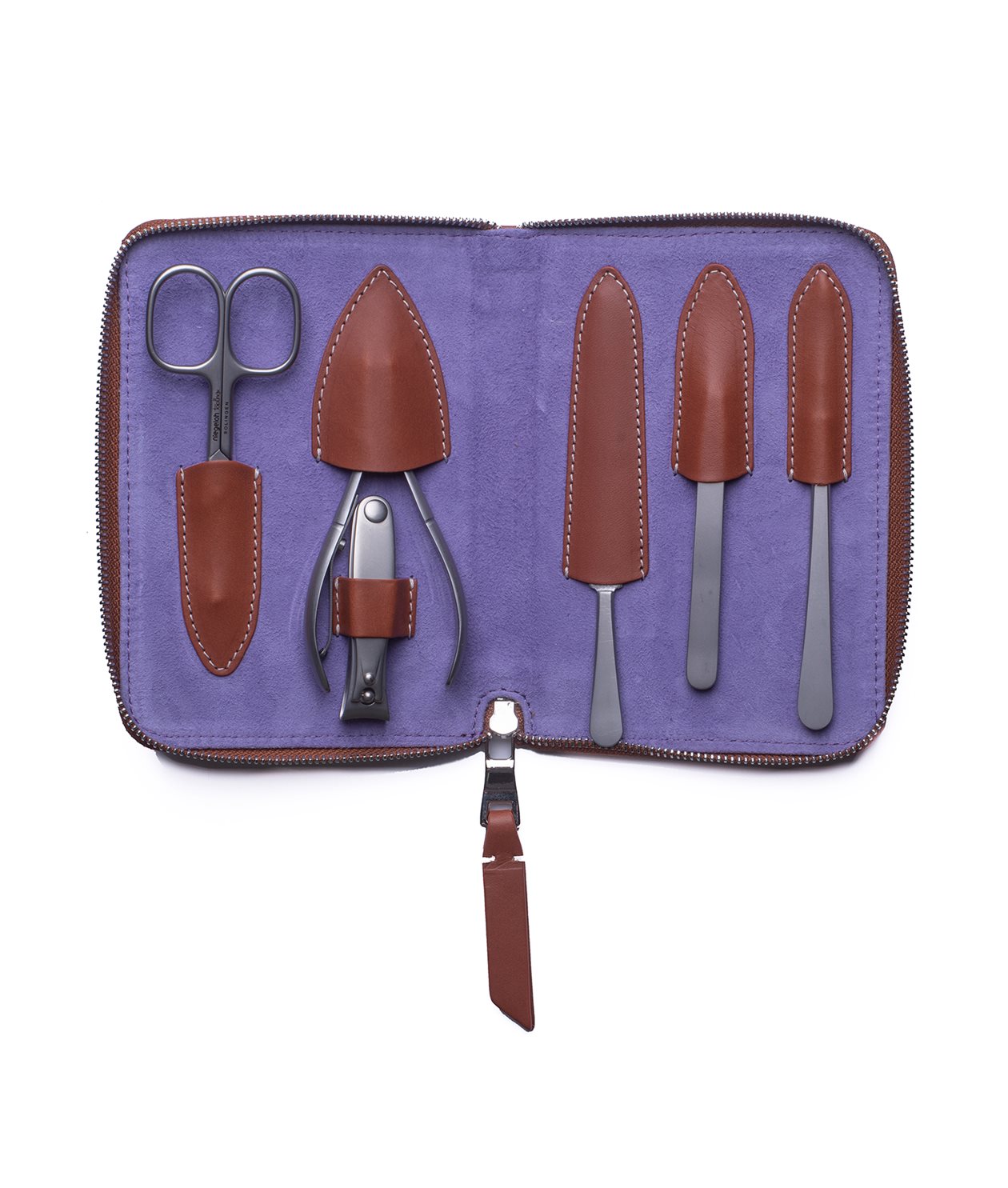 Fodrad med mjuk lila getmocka och sex verktyg i rostfritt stål, tillverkade i Solingen, Tyskland. Samtliga verktyg slipas och färdigställs för hand, vilket resulterar i fantastiska verktyg med livstidsgaranti.
