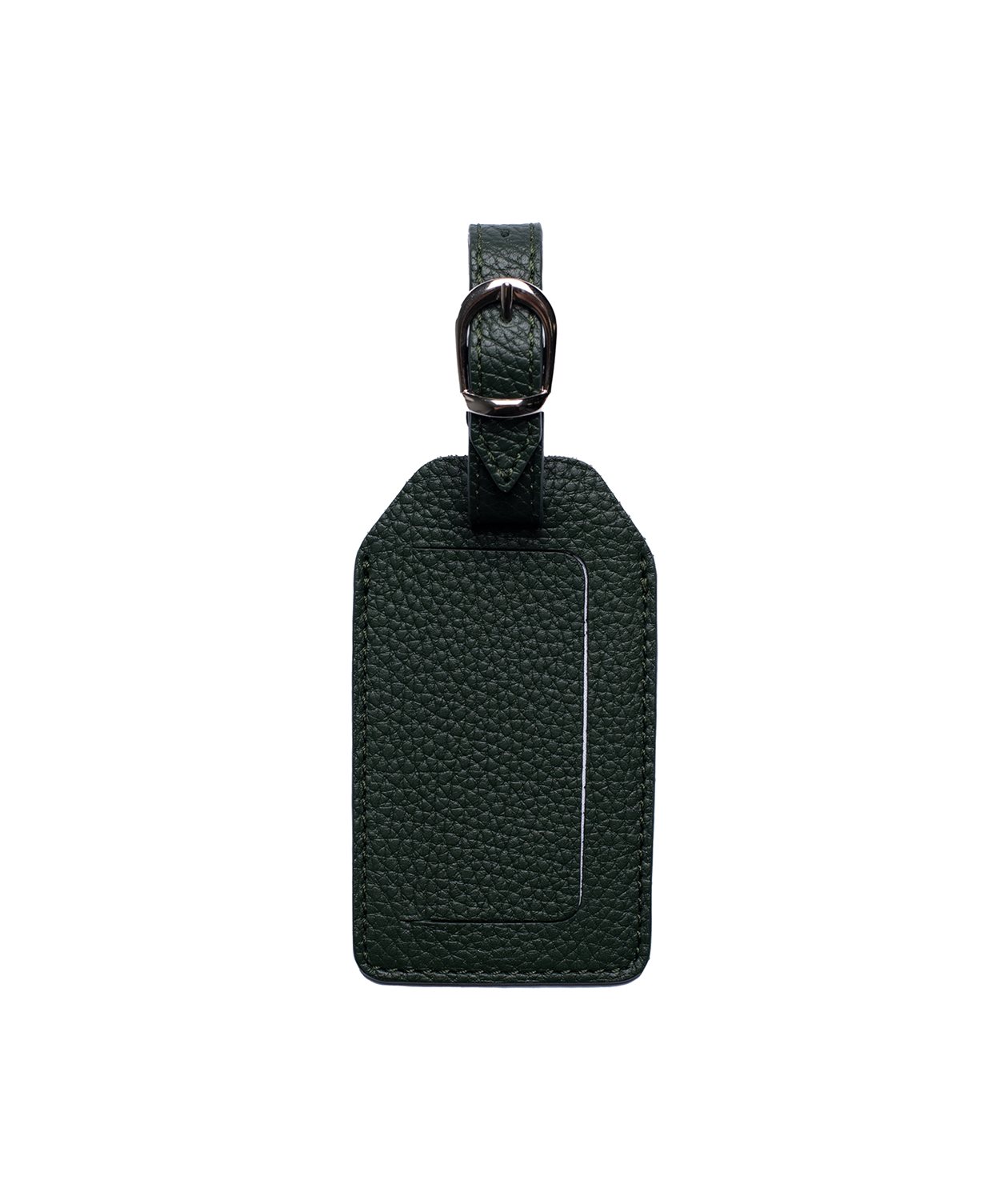 Bagagetag sydd i ett grängat kalvläder med svart söm.