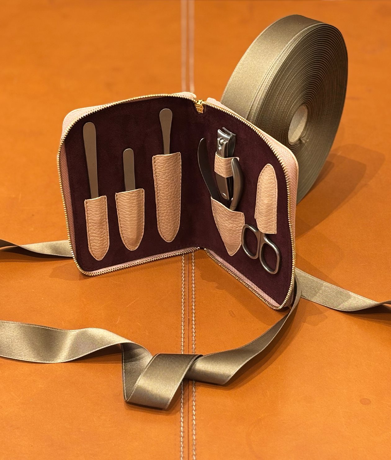 Manikyrset med sex verktyg, sydd i ett grängat kalvläder.