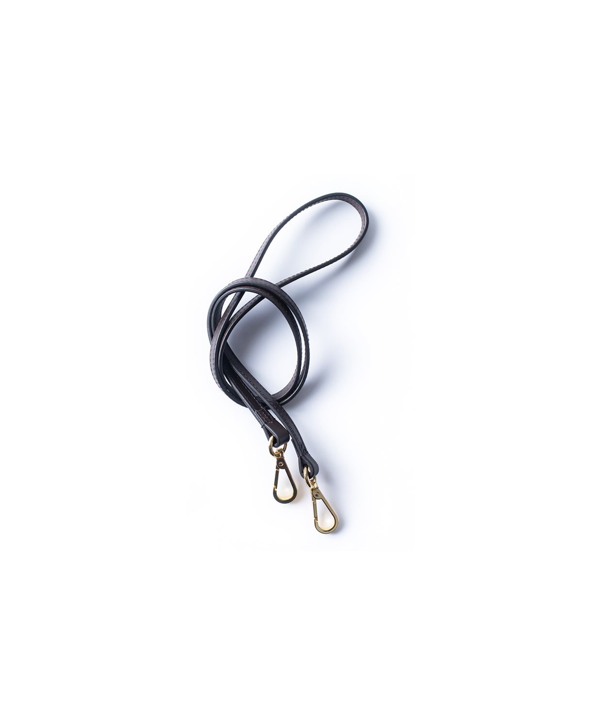 Vår smala axelrem, sydd i ett slätt kalvläder och avslutad med karbinhakar i gul metall.