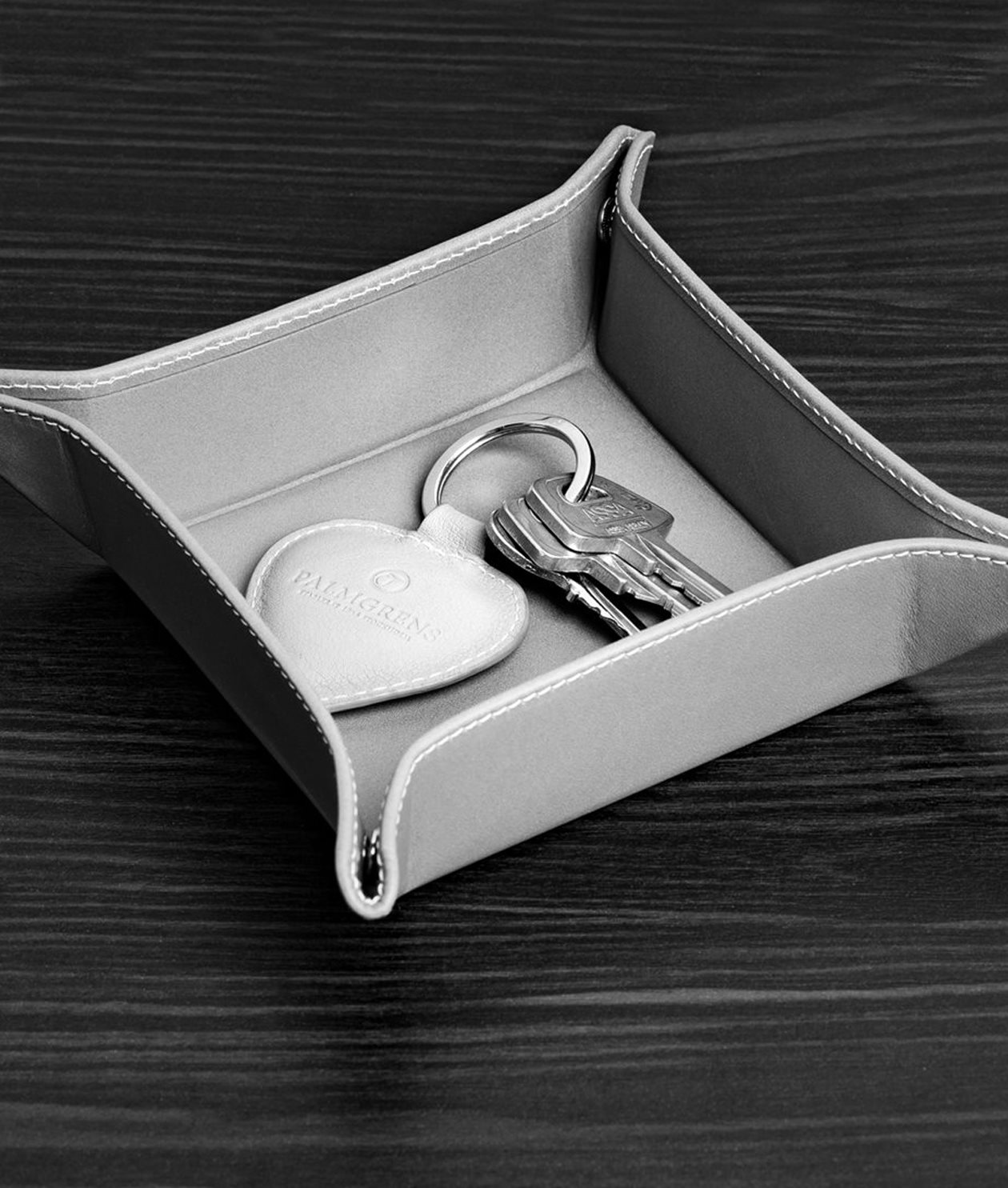 Vårt fat i slätt kalvläder med dolda tryckknappar i hörnen.