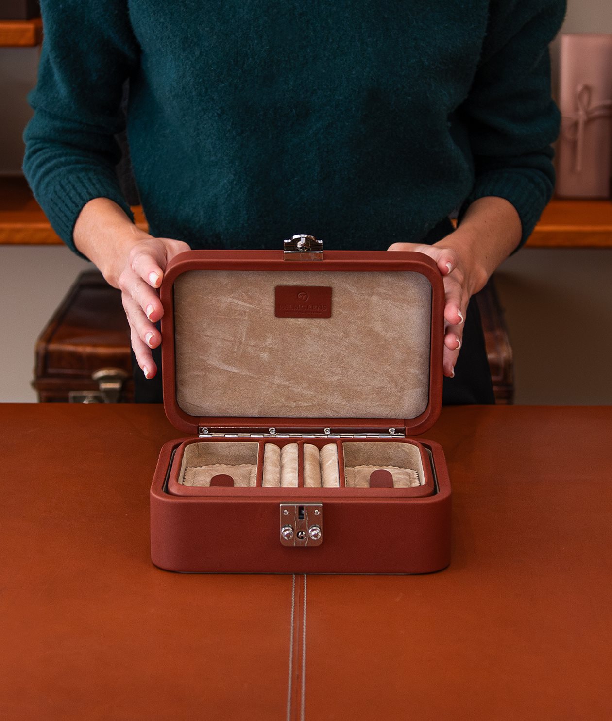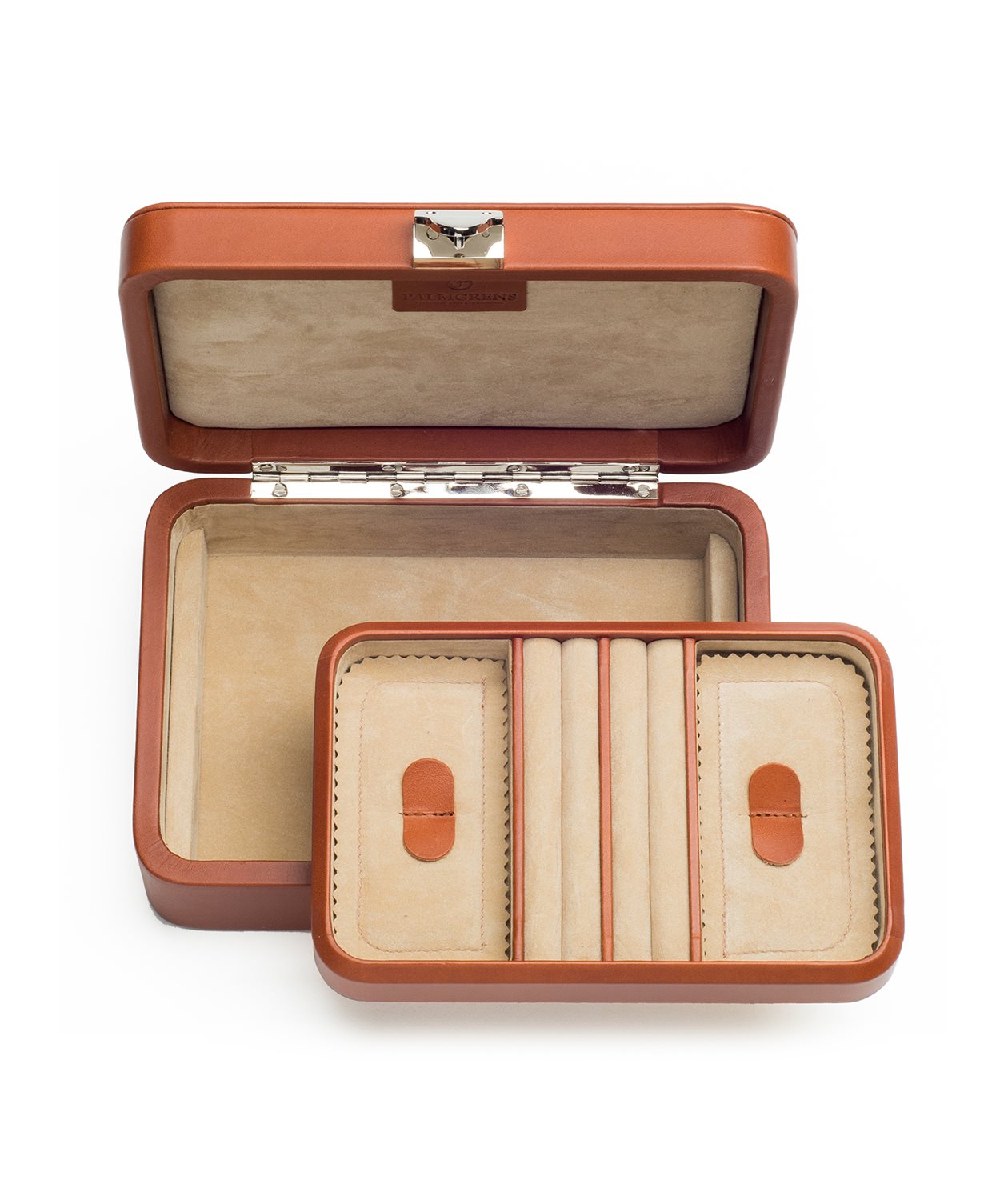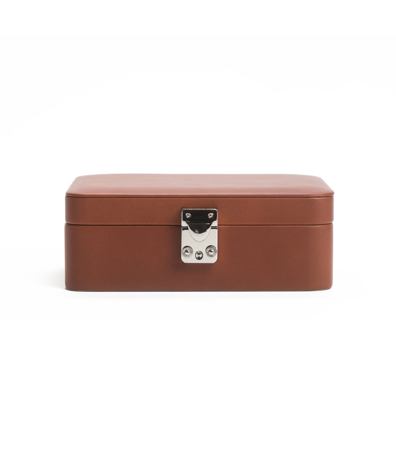 Vårt smyckeskrin med rundade hörn, klätt i ett vegetabiliskt garvat kalvläder.