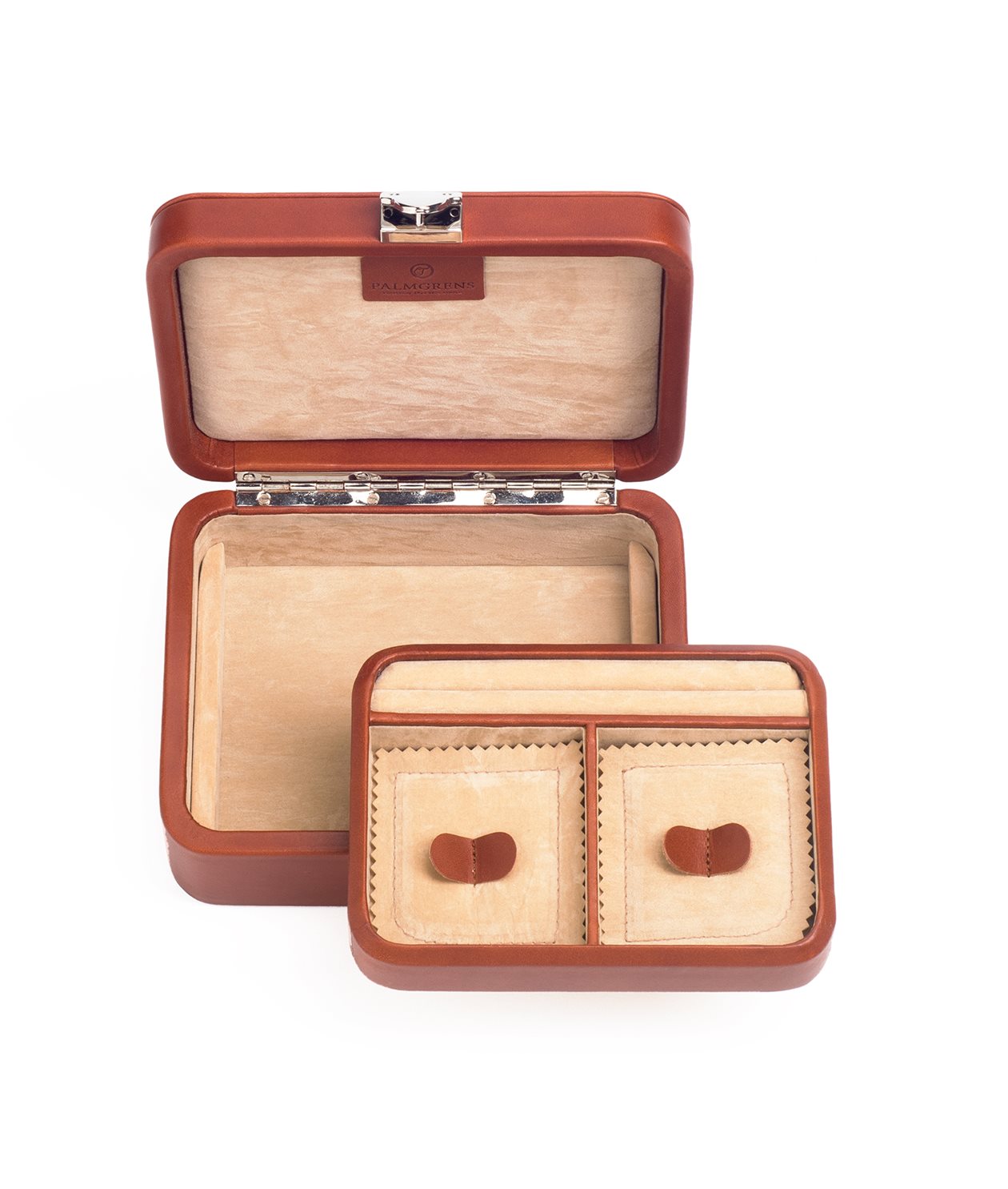 Med rader för ringar, örhängen eller manschettknappar, två fack och djupt bottenplan för stela smycken.